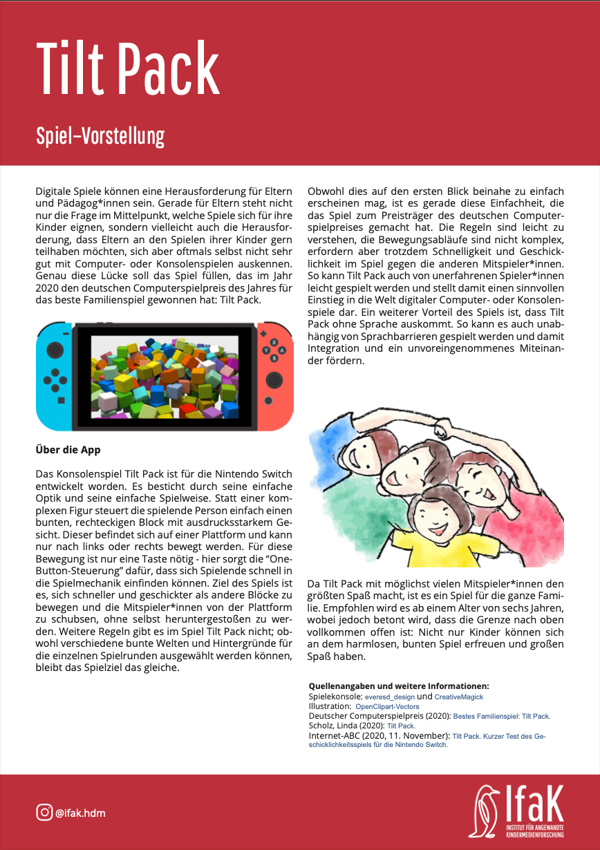 Digitale Spiele können eine Herausforderung für Eltern und Pädagoginnen sein. Gerade für Eltern steht nicht nur die Frage im Mittelpunkt, welche Spiele sich für ihre Kinder eignen, sondern vielleicht auch die Herausforderung, dass Eltern an den Spielen ihrer Kinder gern teilhaben möchten, sich aber oftmals selbst nicht sehr gut mit Computer- oder Konsolenspielen auskennen. Genau diese Lücke soll das Spiel füllen, das im Jahr 2020 den deutschen Computerspielpreis des Jahres für das beste Familienspiel gewonnen hat: Tilt Pack.