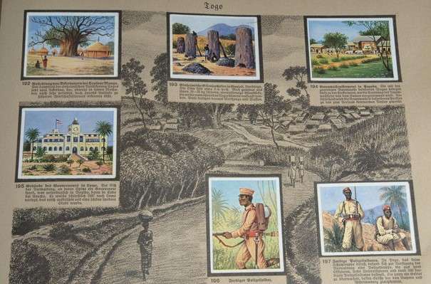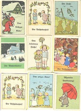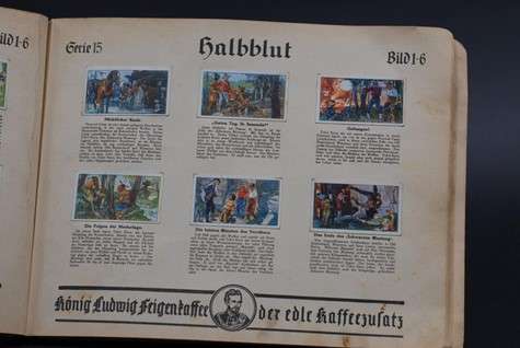Auch die KinderMedienWelten verfügen über ein breites Spektrum an Sammelmedien. Neben Stickern, berühmten Alben und Poesiealben lassen sich auch Zigarettenbildchen wiederfinden. Im Zuge eines Projektes wird es voraussichtlich im Sommer 2022 eine Ausstellung geben, um genau dieses Thema und dessen historische Entwicklung aufzuzeigen. In Abbildung 1 sind Zigarettenbildchen aus dem Jahr 1936 zu sehen, welche die deutschen Kolonien zeigen. Darüber hinaus verfügt die Sammlung, wie in Abbildung 2 zu sehen ist, auch über Fleißbildchen. Diese Fleißbildchen zeigen idyllische Kindheitsszenen im Stil Ida Bohattas mit Beschriftung in Fraktur. “Mit Karl May um die Erde” ist ein Sammelalbum aus dem Jahr 1936, welches Textausschnitte und Szenen aus den Romanen Karl Mays darstellt. Jedem Werk ist eine Serie à sechs Bildern gewidmet. Vertrieben von der Firma König Ludwig Feigenkaffeefabrik Georg Wöhrle München-Ost.
