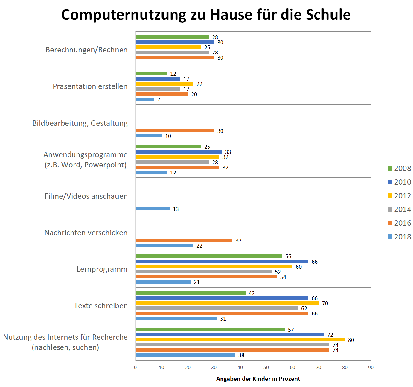 Die Studie gab als Auswahlmöglichkeit auch Anwendungsprogramme wie beispielsweise Word und PowerPoint an. Die Werte hierfür waren tendenziell sehr gering, 2008 gab rund ein Viertel an, diese Computerarbeit für die Schule zu verrichten (KIM-Studie 2008, 2008, S. 37), 2010 waren rund ein Drittel damit zu Hause beschäftigt (KIM-Studie 2010, 2010, S. 28). Zwei Jahre später sank der Wert um einen Prozentpunkt (KIM-Studie 2012, 2012, S. 30), wohingegen der Wert im Jahr 2014 weitere vier Prozentpunkte verlor (KIM-Studie 2014, 2014, S. 41). 2016 gaben jedoch wieder 32 % (KIM-Studie 2016, 2016, S. 51) an, sich mit Anwendungsprogrammen von zu Hause aus zu beschäftigen. 2018 gaben nur noch 12 % (KIM-Studie 2018, 2018, S. 50) der Befragten an, sich mit Anwendungsprogrammen auseinanderzusetzen und stellte somit das Jahr mit den wenigsten Prozentpunkten im Vergleich zu den vorherigen Jahren dar.
